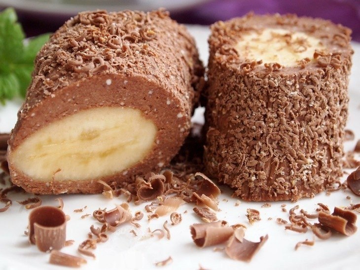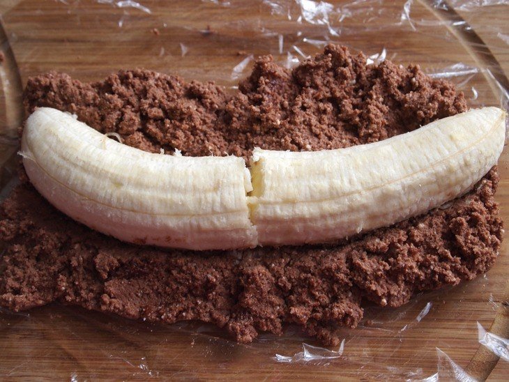 3. А теперь первый вариант подачи десерта. Шоколадно-творожную массу распределить на пищевой пленке. Сверху положить банан. Сформировать “колбаску”. Убрать в холодильник минут на 20 для застывания.