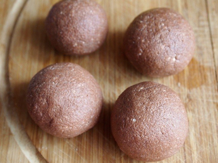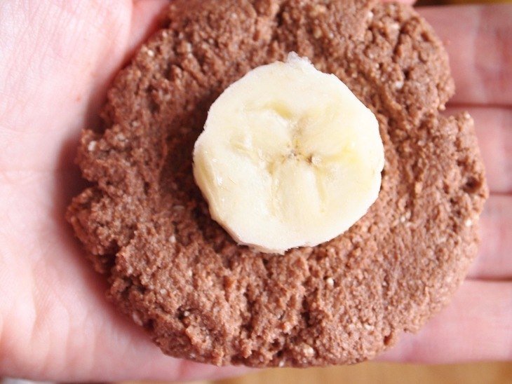 4. Второй вариант подачи: банан порезать на кружочки. От теста отщипывать небольшой кусочек, сделать лепешку. В центр лепешки положить кусочек банана. Скатать в шарики. Также убрать в холодильник на 20 минут.