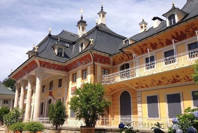 Итак, еще раз бросив взгляд на резвящихся уток и золотых рыбок в пруду, мы двинули дальше к цели нашего путешествия — Дворец Пи́льниц — загородной резиденции саксонских монархов из династии Веттинов, о которых я уже вспоминал в рассказе о Дрезненском замке. В конце XVII века курфюрст Иоганн Георг IV приобрёл имение Пильниц для своей фаворитки, графини фон Рохлиц. Позднее его преемник Август Сильный, который был кстати и королем Речи Посполитой Трех народов, поручил архитекторам М. Д. Пёппельману и 3. Лонглюну выстроить на берегу Эльбы лёгкий дворец в «китайском вкусе». И этот псевдокитайский стиль или вкус чувствуется во всем — в отделке дворцов, тонком доборе растений парка, в китайской беседке. Мы оставили машину на паркинге перед дворцом и купили билеты в кассе — здесь отдельно можно посетить территорию и парк за 3 евро, и дворцовую экспозицию — 8 е. кстати билеты довольно дешевые — не то, что в галерею в Дрездене (15Е)