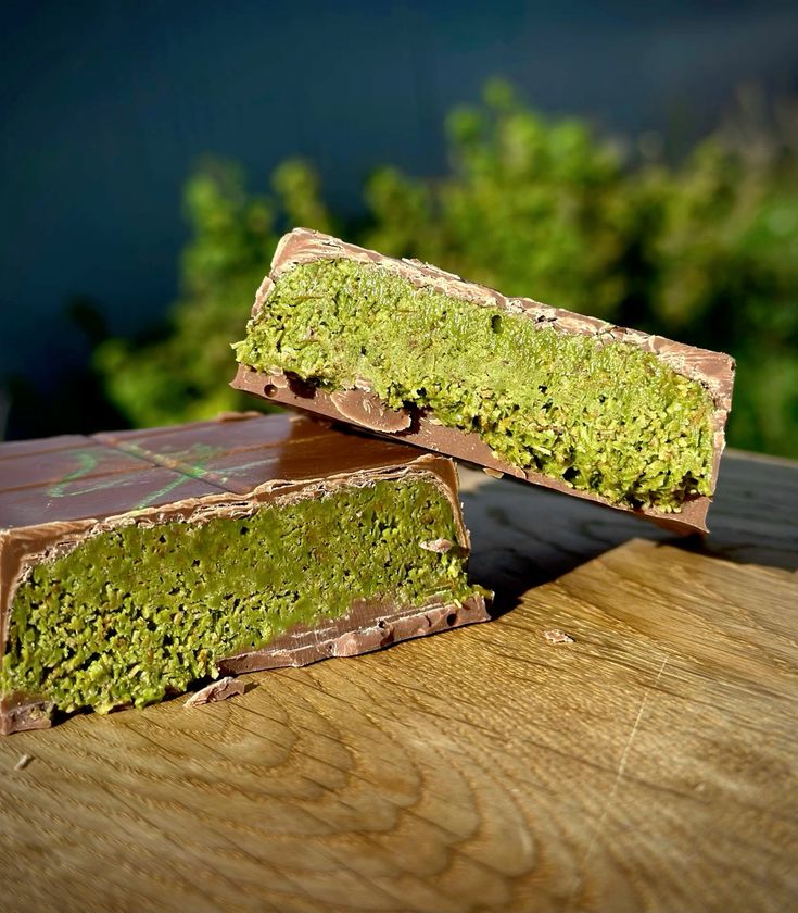 Речь идет о шоколадной плитке с начинкой из фисташковой пасты и теста катаифи. Хрустящая масса ярко-зеленого цвета оказалась неожиданным, но очень вкусным дополнением ко вкусу шоколада.