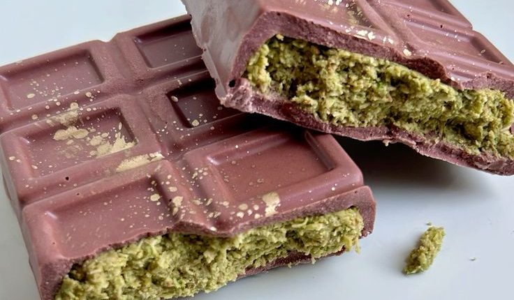 Речь идет о шоколадной плитке с начинкой из фисташковой пасты и теста катаифи. Хрустящая масса ярко-зеленого цвета оказалась неожиданным, но очень вкусным дополнением ко вкусу шоколада.