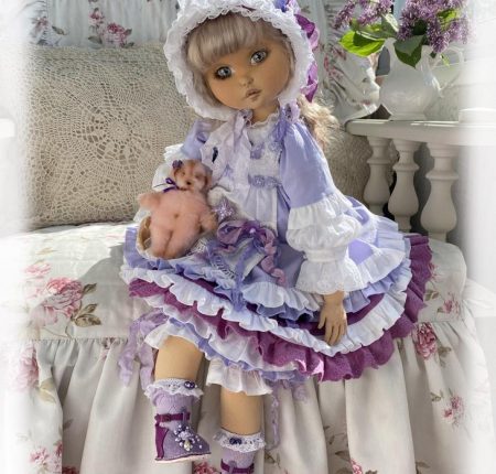 Малышка сшита из хлопка, обтянута трикотажем. Личико объёмное. Девчушка вся подвижная. Головушка крутится и наклоняется. Ручки и ножки крепятся, как у будуарных кукол или куклы-болтушки. Душечка стоять не хочет, зато она умеет красиво сидеть и мило складывать ручки. Пальчики на ручках гнутся, есть маникюр. Волосы натуральные кудри овечки, очень мягкие, можно аккуратно менять прическу. Вся одежда съёмная, кроме комбинезона. Одежка сшита из хлопка, батиста, украшена кружевом, шебби лентами. Туфельки из натуральной итальянской замши. Рост малышки около 55 см.