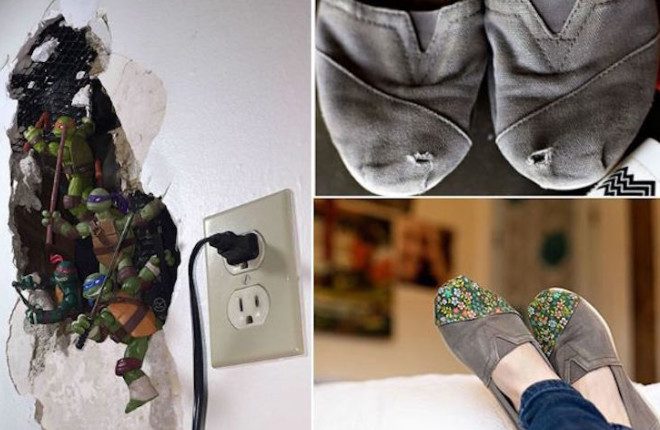 Трещина в двери может быть креативно оформлена и напоминать сцену из популярной киноленты «Сияние», дыра в стене может стать настоящим произведением искусства, а разбитый автомобильный бампер легко можно превратить в убежище для маленьких игрушечных фигурок…
