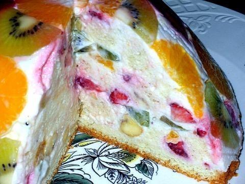 Замочить желатин в воде на 30-40 мин. Форму для торта выстелить пищевой пленкой. Порезать фрукты дольками и красиво уложить на стенки формы. Остальные фрукты порезать небольшими кубиками. Взбить сметану с сахаром и ванилином до кремообразной массы. Нагрев, распустить желатин (не доводя до кипения). Желатин примешать к сметанному крему, всыпать фрукты и бисквитные кубики. Быстро, но аккуратно перемешать и выложить в подготовленную форму. Сверху накрыть бисквитной пышкой, немного придавив её. Закрыть торт свисающими краями пленки и убрать в холодильник (желательно на ночь). Затем раскрыть края пленки, накрыть торт блюдом (на котором он будет подаваться) и перевернуть так, чтобы форма с тортом оказалась на блюде. Аккуратно снять форму и пленку.