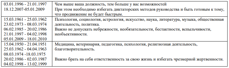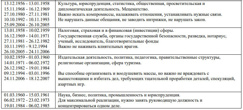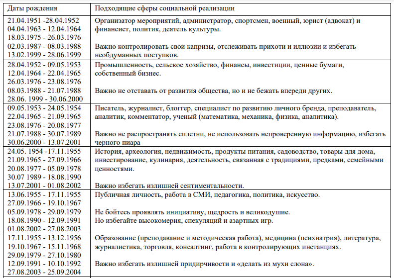 Для того чтобы определить сферу деятельности, которая позволит занять достойное место в обществе, получить признание, уважение и, как следствие, достойное вознаграждение найдите в левом столбце диапазон дат, включающий дату вашего рождения, и прочитайте соответствующую ему рекомендацию.