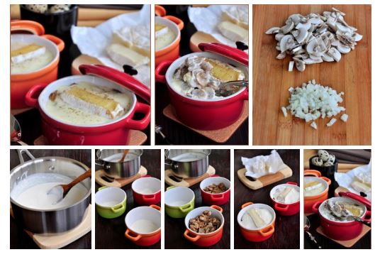 3. Налить на дно жаростойких формочек по несколько столовых ложек сырного соуса. Выложить жаренные грибы, полить оставшимся соусом.