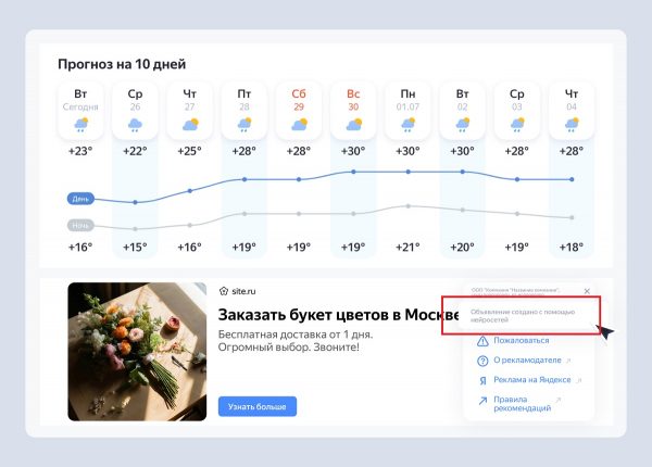 Яндекс первым на российском рынке начал маркировать рекламу, сгенерированную с помощью искусственного интеллекта. Маркировка появилась в рекламных объявлениях с изображениями, автоматически созданными нейросетью YandexART внутри Директа. Увидеть пометку можно на интернет-рекламе с картинкой от нейросети, нажав на три точки в верхнем правом углу объявления.