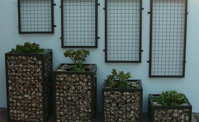 Оригинальными украшениями двора станут колоны из габионной сетки, заполненной камнями. Такие колоны можно использовать, как самостоятельный элемент декора или же, как подставки для цветочных горшков, ваз или садовых статуэток.