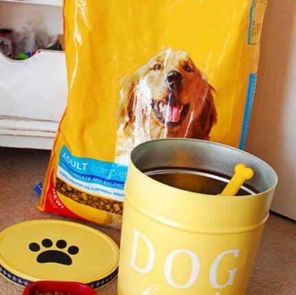 Яркий и вместительный контейнер для собачьего или кошачьего корма, сделанный из большой банки из-под конфет.