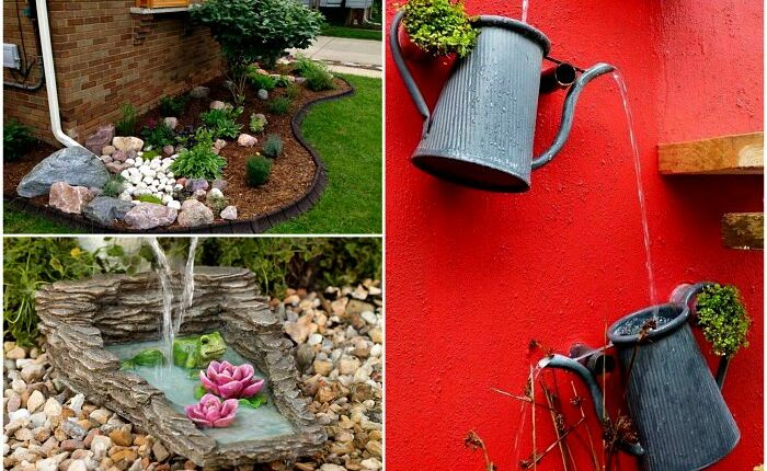 Мини пруд, сооруженный под водосточной трубой, будет наполняться водой после каждого дождя и радовать глаз своим очаровательным внешним видом.