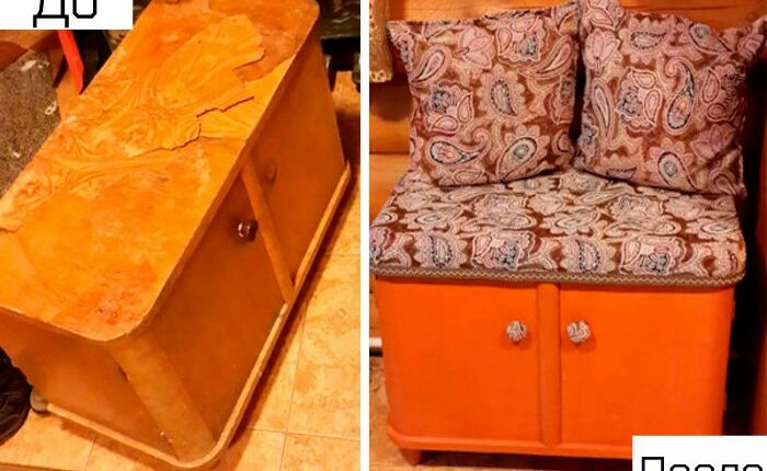Старую тумбу советского образца можно превратить в удобный компактный диванчик с мягким сиденьем и местом для хранения обуви.
