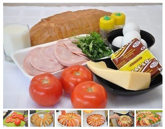 Между ломтиками батона положить дольки помидоров и ветчины.