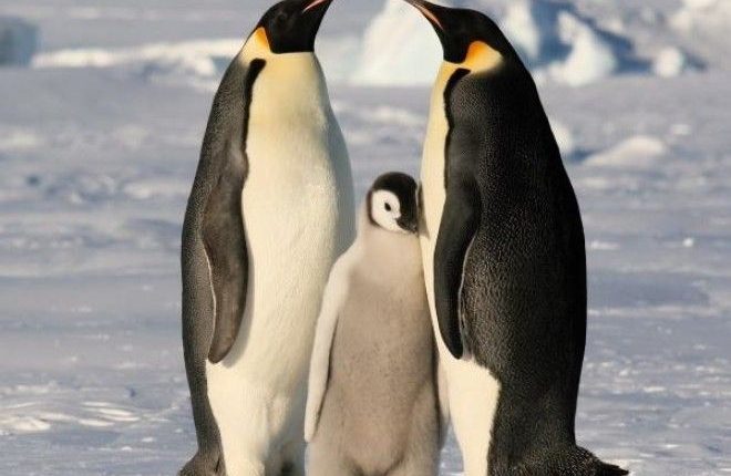Эти птицы сохраняют тепло в своих сердцах в суровых условиях Антарктиды. Они создают семейные пары на долгие годы. Мама и папа по очереди высиживают яйца и кормят малышей.