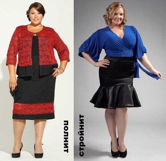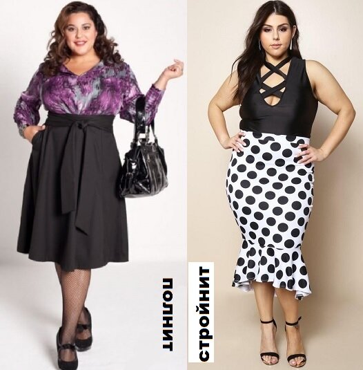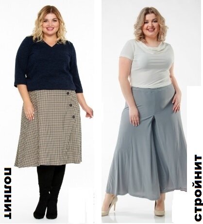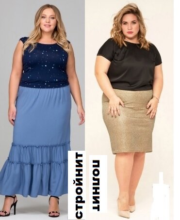 Если же избыточные объемы превышают норму на 2,5 размера и более, то таким женщинам оптимально носить длину юбки или платья от середины икроножной мышцы до щиколотки. При такой длине открывается стройная, изящная часть ноги, и силуэт при этом становится прямоугольным или вытянутым трапециевидным.
