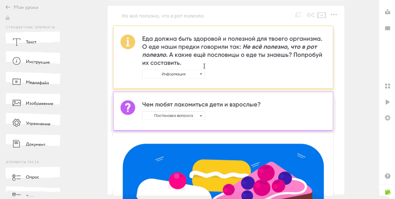 После простой регистрации, вы попадаете в личный кабинет, в котором вы увидите блочный конструктор: перетаскивайте необходимые элементы и выстраивайте необходимую структуру урока.