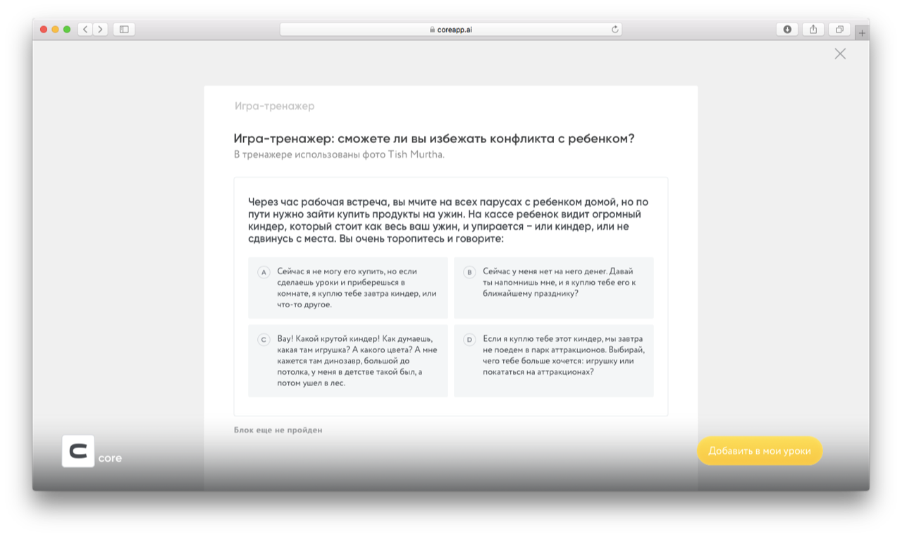 Практическую часть курса можно собрать в виде «диалогового тренажера». С помощью такого формата легче отработать полученные в теоретической части курса навыки.