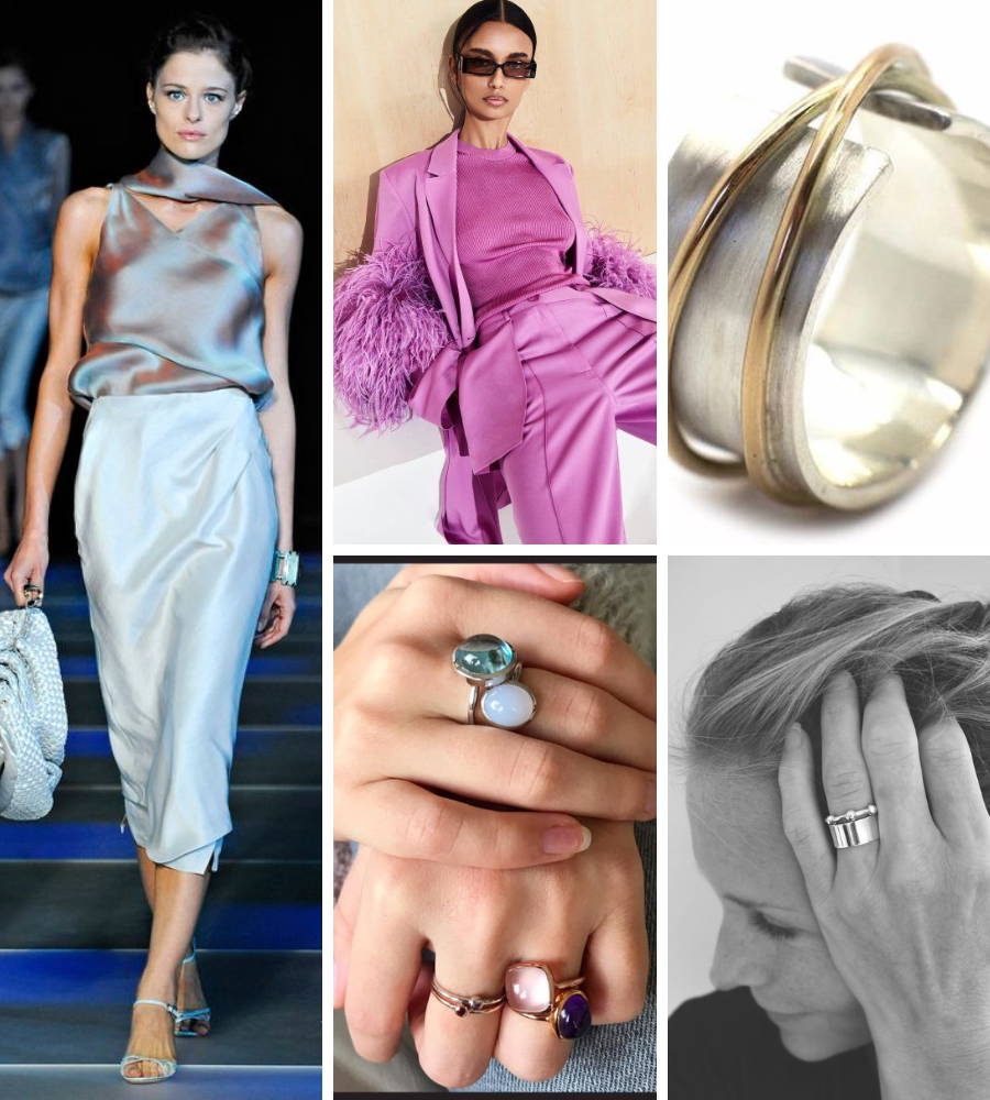 Украшения минимальное количество, тонкие, нежные, легкие. Металл — желтое золото, серебро, медицинский сплав.