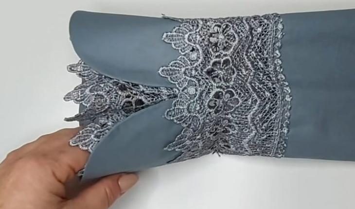 Выверните заготовку на лицевую сторону, отпарьте. Для подготовки кружевной детали отмерьте кружево по ширине рукава, добавляя 4 см на складку.
