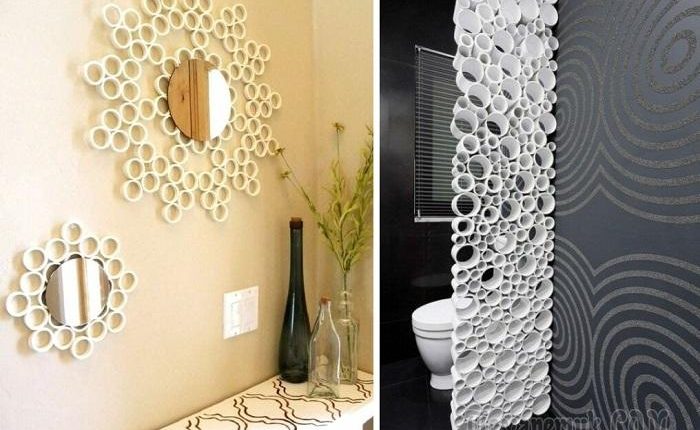 Кружочки с нарезанных труб ПВХ могут стать отличной основой или рамкой для картины, зеркала или фотографий. Композицию можно составить из кругляшков одинакового или разного диаметра, в произвольной форме или, например, в форме сердца, солнца или облачка. Будет смотреться красиво и оригинально. А если использовать золотистую или серебристую краски, то никто даже не догадается, что для основы использованы остатки труб ПВХ.