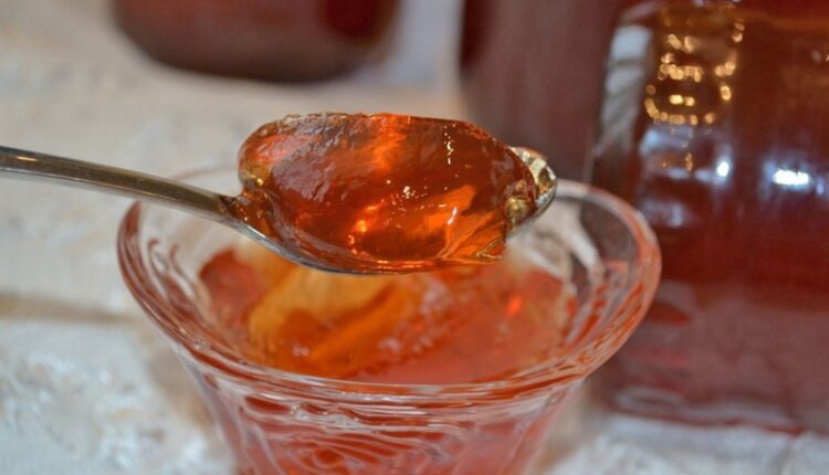 Следующий этап — добавляем сахар, включаем огонь и увариваем сок до загустения. Желе из яблок готово, когда начинает пенится и стекать с ложки не струйками, а крупными каплями. Разливаем горячее желе по стерилизованным баночкам и закрываем крышками.