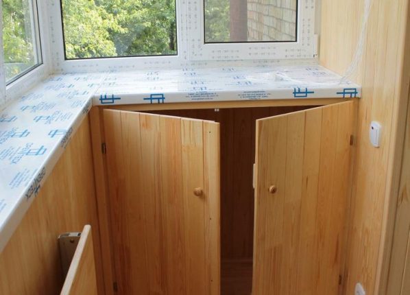 Многое зависит от выбора модели – встроенные варианты не имеют собственных боковых панелей и задней стенки. Это позволяет сэкономить материалы, место и сокращает время работы. Иногда нужно спроектировать угловую конструкцию, требующую особого подхода. Дверки делают раздвижными ил распашными. Первый вариант будет удобен в случае наличия пространства, а второй – для узкого балкона. Ножки для балконной мебели вовсе не обязательны – под ними скапливается пыль, поэтому лучше поставить тумбу прямо на пол или на каркас из брусьев.