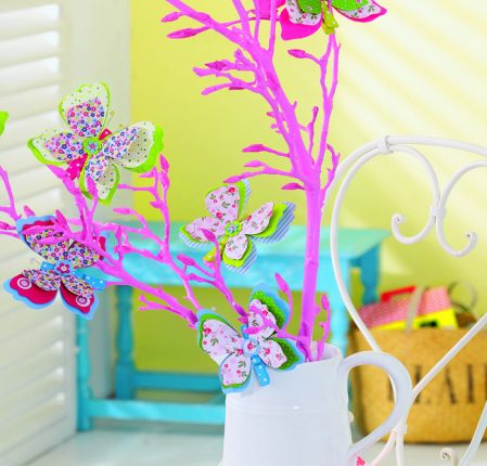 Серебряную проволоку согнуть посередине, на концы проволоки нанизать две стеклянные бусины, концы проволоки согнуть пассатижами в кольцо. После этого бабочек наклеить на деревянные прищепки, при этом наклеить также проволочные усики. В завершение «посадить» бабочек на красивую, окрашенную в розовый цвет ветку.