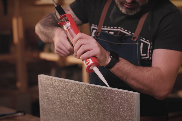 Когда все детали отрезаны, приступаем к сборке. В данном случае для надежности мы будем осуществлять двойную фиксацию с помощью клея и саморезов.