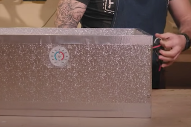 Наша задача – добиться эффекта термоса. Этому могут помешать стыки, через которые все равно теплый воздух может поступать внутрь нашего холодильника. Чтобы это предотвратить, все места стыков проклеиваются фольгированным скотчем.