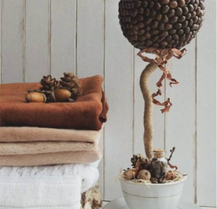 Классический топиарий из кофе – круглый, без особых украшательств, составленный лишь из натуральных материалов и в нейтральной цветовой гамме. Такое дерево выглядит просто, но, пожалуй, элегантнее прочих. В конце статьи вы найдете пошаговый мастер-класс по изготовлению именно такого вида топиария.