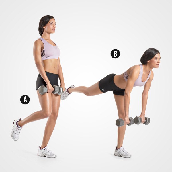 Балансируя поочередно на каждой ноге с гантелями в руках, поднимите в воздух другую ногу в позе ласточки. Сделайте три подхода по 10 повторений на каждую ногу, отдыхая минуту между подходами.
