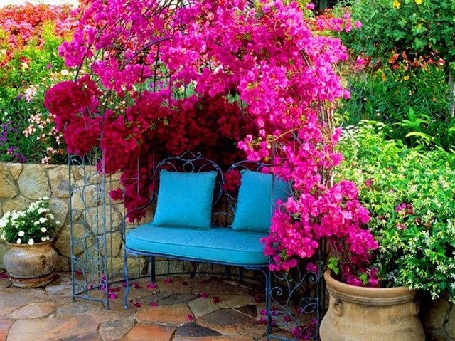 Для погружения в природный мир высадите вокруг такой мебели (если она стационарная) цветущие растения, чтобы во время отдыха наслаждаться свежим ароматом роз, гиацинтов или флоксов.