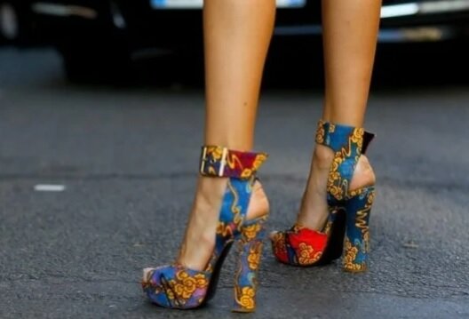 Чтобы быть в тренде, туфли на шпильке или высоком каблуке должны быть выполнены из материалов с яркими цветными принтами.