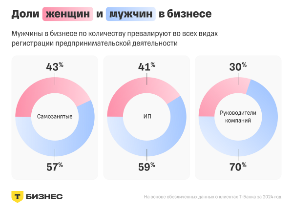 Женщины в бизнесе продолжают уступать мужчинам по численности. По состоянию на 2024 году среди самозанятых и ИП доля женщин составляет 43 и 41% соответственно. В наименьшей степени женщины представлены в качестве руководительниц компаний: 30%.