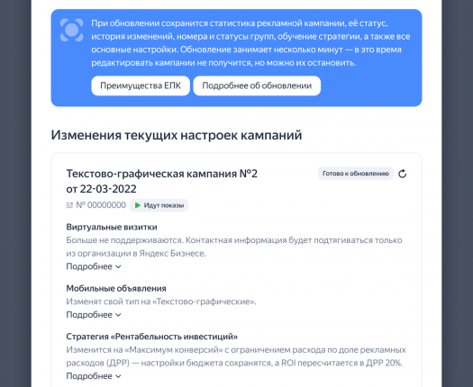 Изменения затронут кампании, в которых используется устаревший функционал, недоступный в ЕПК. Список этих изменений можно будет увидеть в отдельном окне после выбора кампаний для обновления.