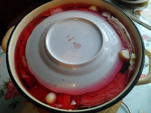 4. Заливаем горячим рассолом уложенные слои овощей, кладём гнёт в виде перевёрнутой вверх дном тарелки и закрываем крышкой. Через 4-5 дней капуста готова.