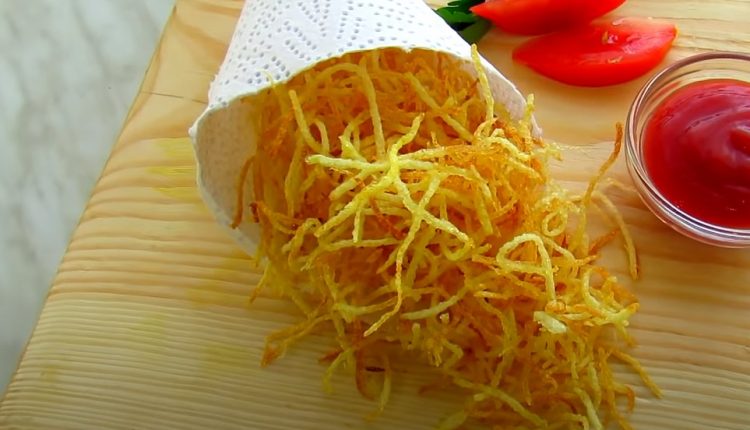 Подобно корейской моркови, картофель пай нарезают тонкими полосками на специальной терке.