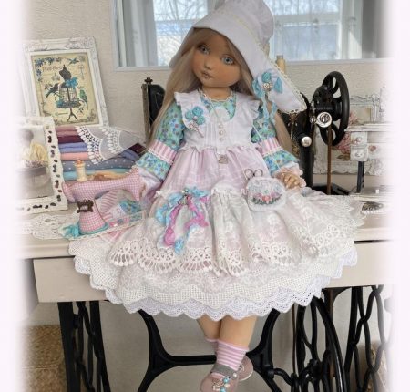Знакомьтесь, Катюша рукодельница. Коллекционная текстильная кукла. Малышка сшита из хлопка, обтянута трикотажем. Личико объёмное. Девчушка вся подвижная. Головушка крутится и немного наклоняется. Ручки и ножки крепятся, как у будуарных кукол или куклы-болтушки. Катенька стоять не хочет, зато она умеет красиво сидеть и мило складывать ручки. Пальчики на ручках гнутся, есть маникюр. Волосы — натуральная козочка, очень мягкие, можно аккуратно расчесывать, закручивать, менять прическу. Вся одежда съёмная, кроме комбинезона. Одежда сшита из хлопка, батиста, украшена кружевом, бисером, шебби-лентами. Ботиночки сшиты из натуральной замши. У Катеньки есть все принадлежности для работы. Сумочка, ножницы портновские, маленькие ножницы, утюжок, пуговки и конечно швейная машинка. Рост куколки около 55 см. Обещает быть хорошей помощницей для мамочки.