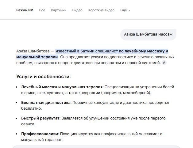 ИИ либо даёт размытое описание, либо опирается на случайные источники, либо вовсе не использует бизнес или эксперта в ответах по профильным запросам. В результате специалист или компания остаются вне поля рекомендаций именно в тот момент, когда пользователь ищет решение и готов выбирать.