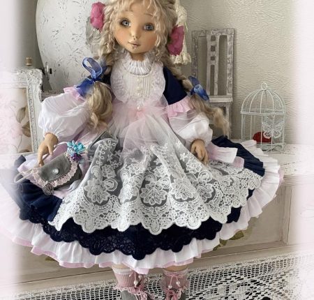 Знакомьтесь, Аннушка. Коллекционная текстильная кукла. Малышка сшита из хлопка, обтянута трикотажем. Личико объёмное. Девчушка вся подвижная. Головушка крутится и немного наклоняется. Ручки на шарнирах, ножки крепятся, как у будуарных кукол или куклы-болтушки. Анюта стоять не хочет, зато она умеет красиво сидеть и мило складывать ручки. Пальчики на ручках гнутся, есть маникюр. Волосы — натуральная козочка, очень мягкие, можно аккуратно расчесывать, закручивать, менять прическу. Вся одежда съёмная, кроме панталон. Одежда сшита из хлопка, батиста, украшена кружевом, бисером. Ботиночки сшиты из натуральной замши. У Анны есть сумочка и гребешок. Рост куколки около 56 см. Обещает быть хорошей доченькой для мамочки.
