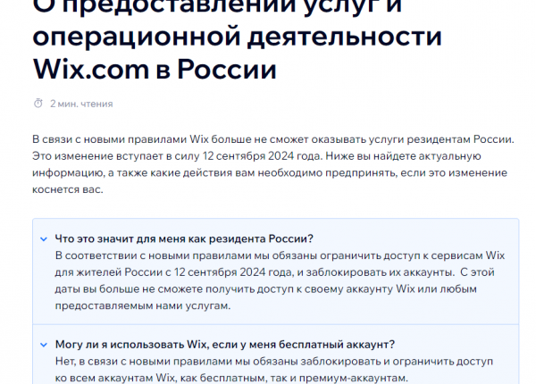 В соответствии с новыми правилами мы обязаны ограничить доступ к сервисам Wix для жителей России с 12 сентября 2024 года, и заблокировать их аккаунты. С этой даты вы больше не сможете получить доступ к своему аккаунту Wix или любым предоставляемым нами услугам… Мы обязаны заблокировать и ограничить доступ ко всем аккаунтам Wix, как бесплатным, так и премиум-аккаунтам, – говорится в сообщении.
