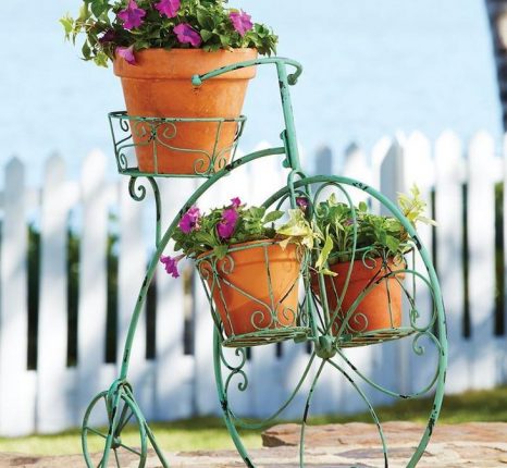 Три цветочных горшка расположены на разных уровнях на кованой подставке