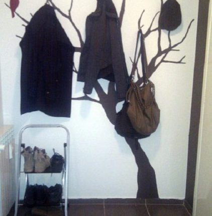 Интересный и простой элемент декора — нарисованное дерево на стене с вешалками.