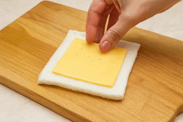На каждый ломтик хлеба положите ломтик сыра. Сложите хлеб пополам или скрутите в трубочку, прижимая края, чтобы сохранить форму.