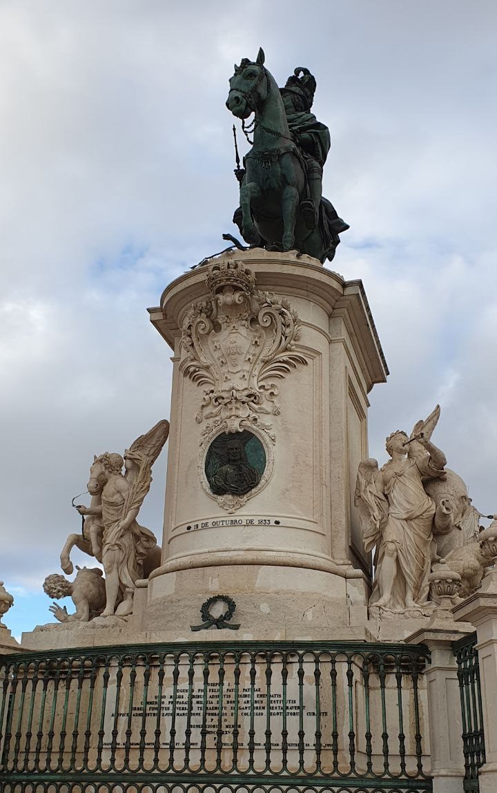 В центре площади возвышался огромный памятник одному из португальских королей, величественно восседавшем на коне, а по диаметру симметрично раскинулись длинные колоннады под сводами, создавая торжественный овал по периметру площади.
