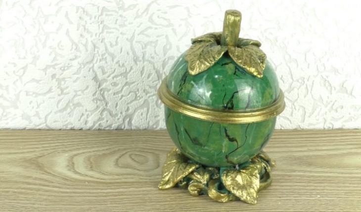 Вот такую «малахитовую» шкатулку в виде яблока можно сделать своими руками и из самых простых материалов. В дальнейшем, пользуясь этой техникой, можно сымитировать и другие камни, например, мрамор.