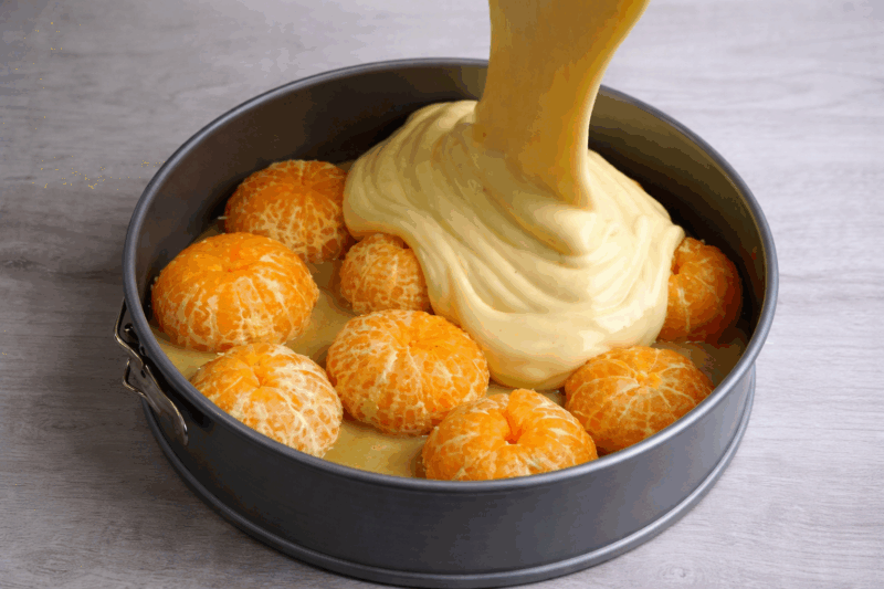 - Соберите пирог: разложите половинки мандаринов по кругу на дно формы (срезом вниз или вверх — как нравится), залейте тестом и разровняйте.
