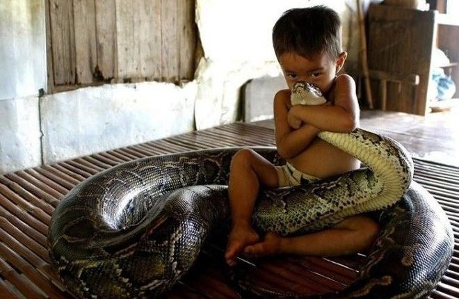 Так в одном камбоджийской деревне мальчик завел себе питомца – 5-метрового питона. Вот уже несколько лет это его неразлучный