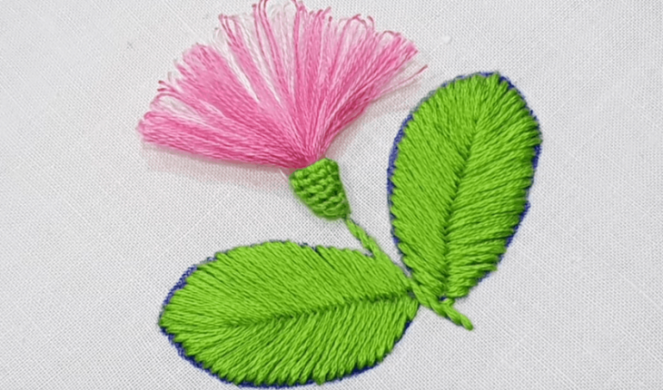 Вышивать листочки начинаем по направлению от верхушки к стеблю. Каждый стежок прокладываем от контра к середине, чтобы обозначить ложбинку. Стежки делаем поочередно то с одной, то с другой стороны.
