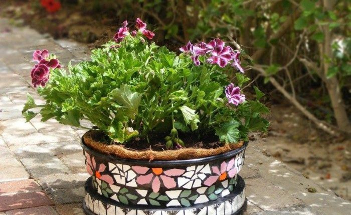 Цветы в горшке, декорированном плиткой, выглядят еще красивее.
