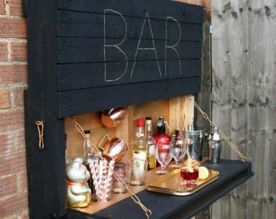 Стильный навесной мини-бар, сделанный из деревянного поддона, выкрашенного в черный цвет, с откидной крышкой станет стильным украшением фасада дачного дома и полезной вещицей для всех любителей коктейльных вечеринок.